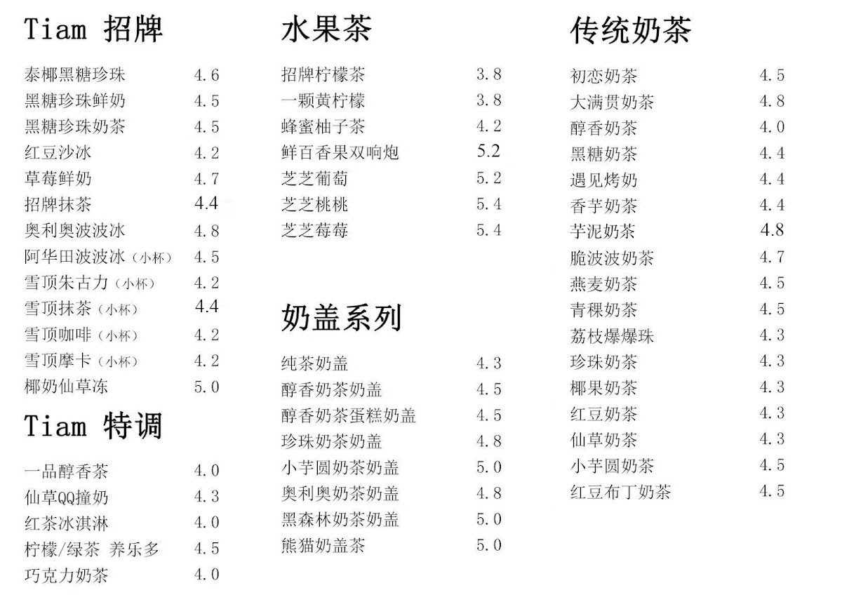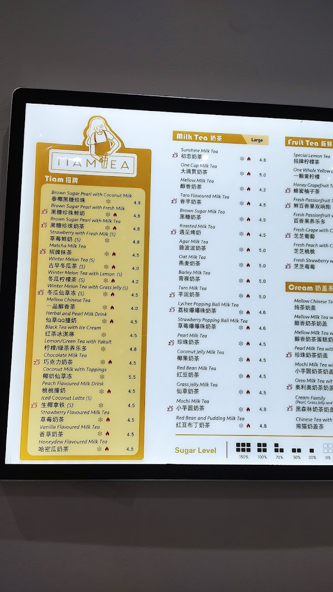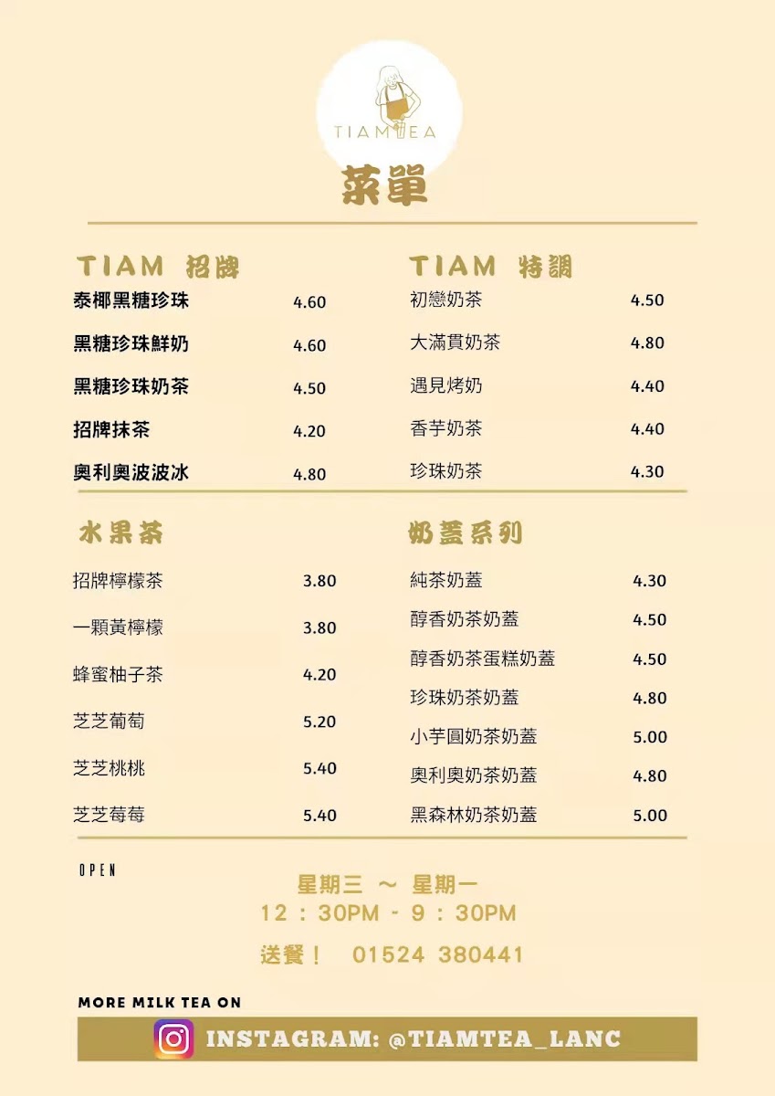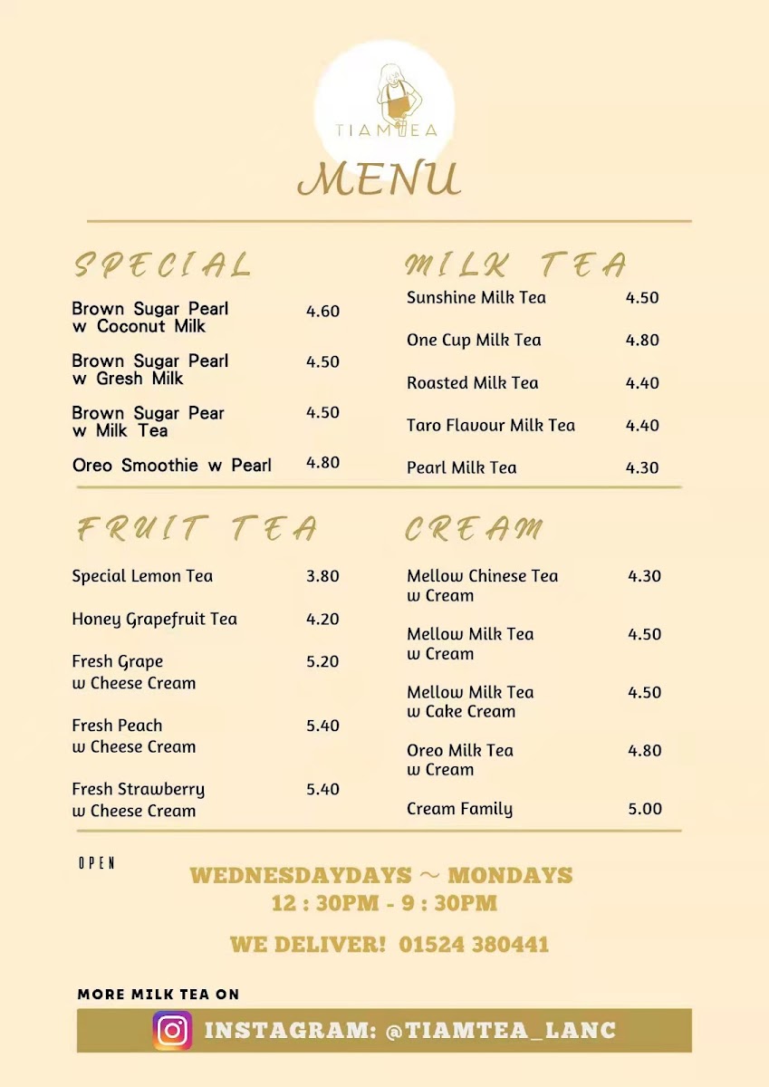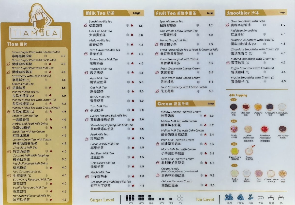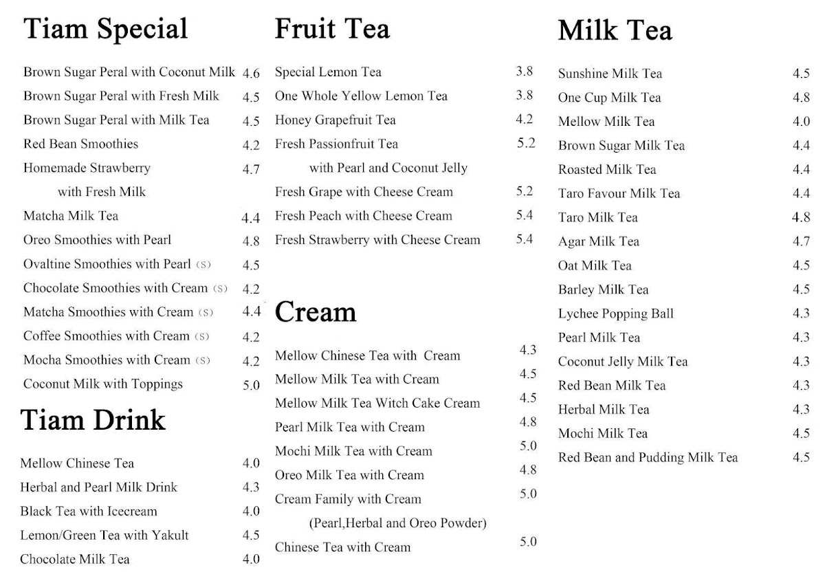 Tiam Tea offers a diverse and exciting menu, perfect for those looking to indulge in refreshing and flavorful beverages. Among its standout offerings, the Brown Sugar Pearl with Fresh Milk is a fan favorite, combining the rich taste of brown sugar pearls with smooth fresh milk for a delightful treat. Similarly, the Brown Sugar Milk Tea stands out for its sweet and velvety flavor, with a perfect balance of brown sugar and milk tea. For matcha enthusiasts, the Matcha Milk Tea provides a creamy, earthy taste, making it a must-try for anyone who enjoys the bold flavor of matcha. The menu also includes a variety of Juices, which are both refreshing and healthy, offering a great option for those who prefer something lighter. Whether you're in the mood for something sweet, creamy, or fresh, Tiam Tea’s menu provides an appealing selection for every palate.
